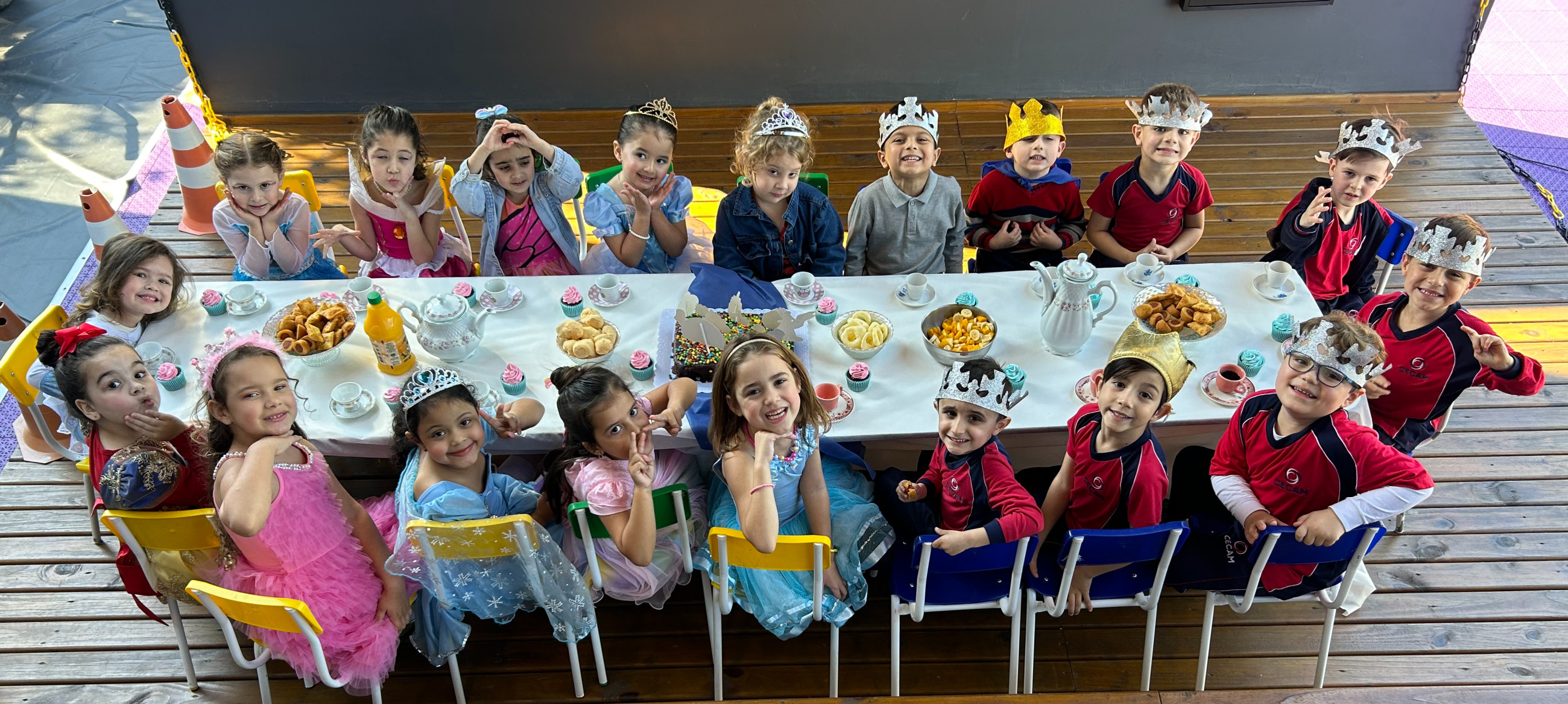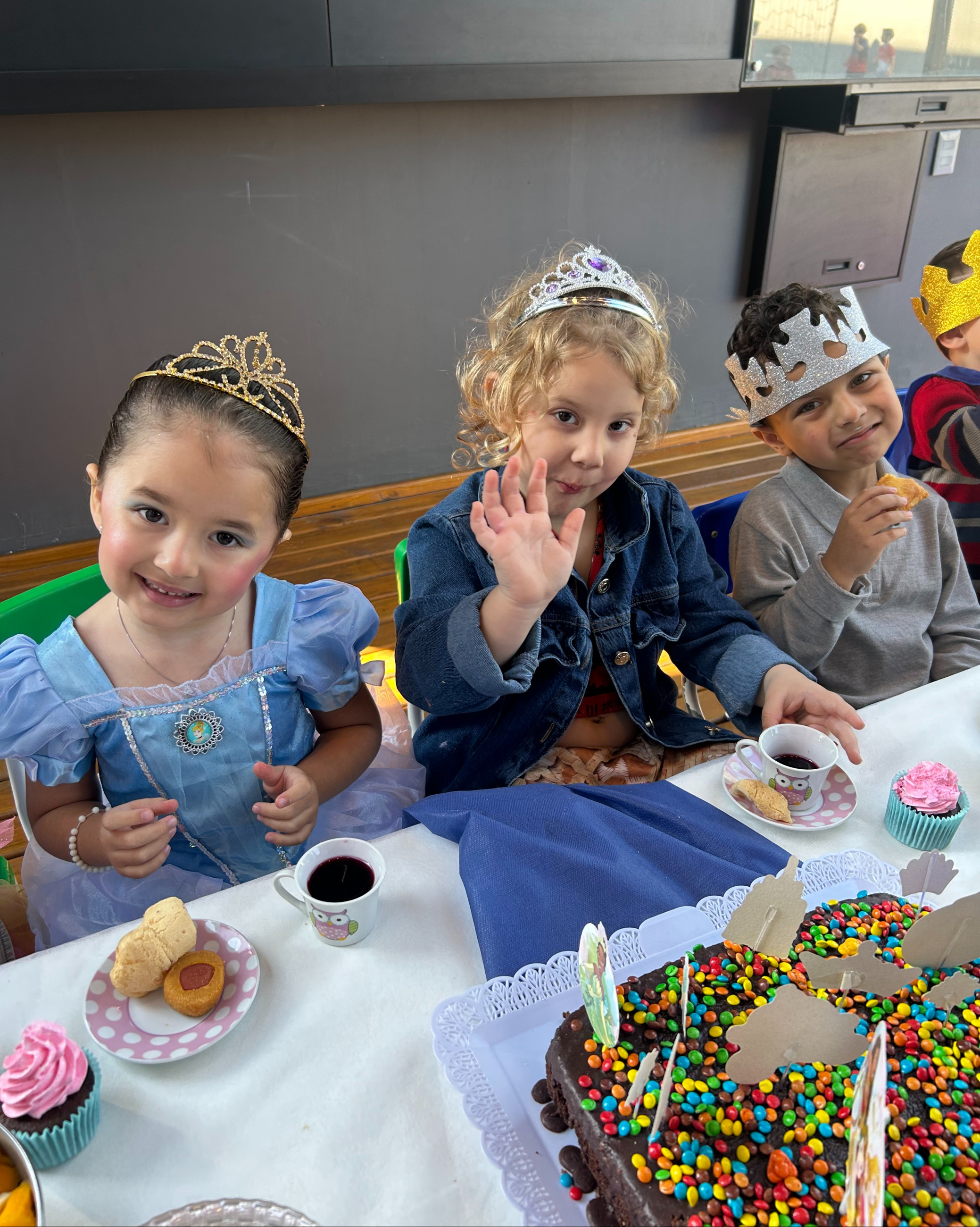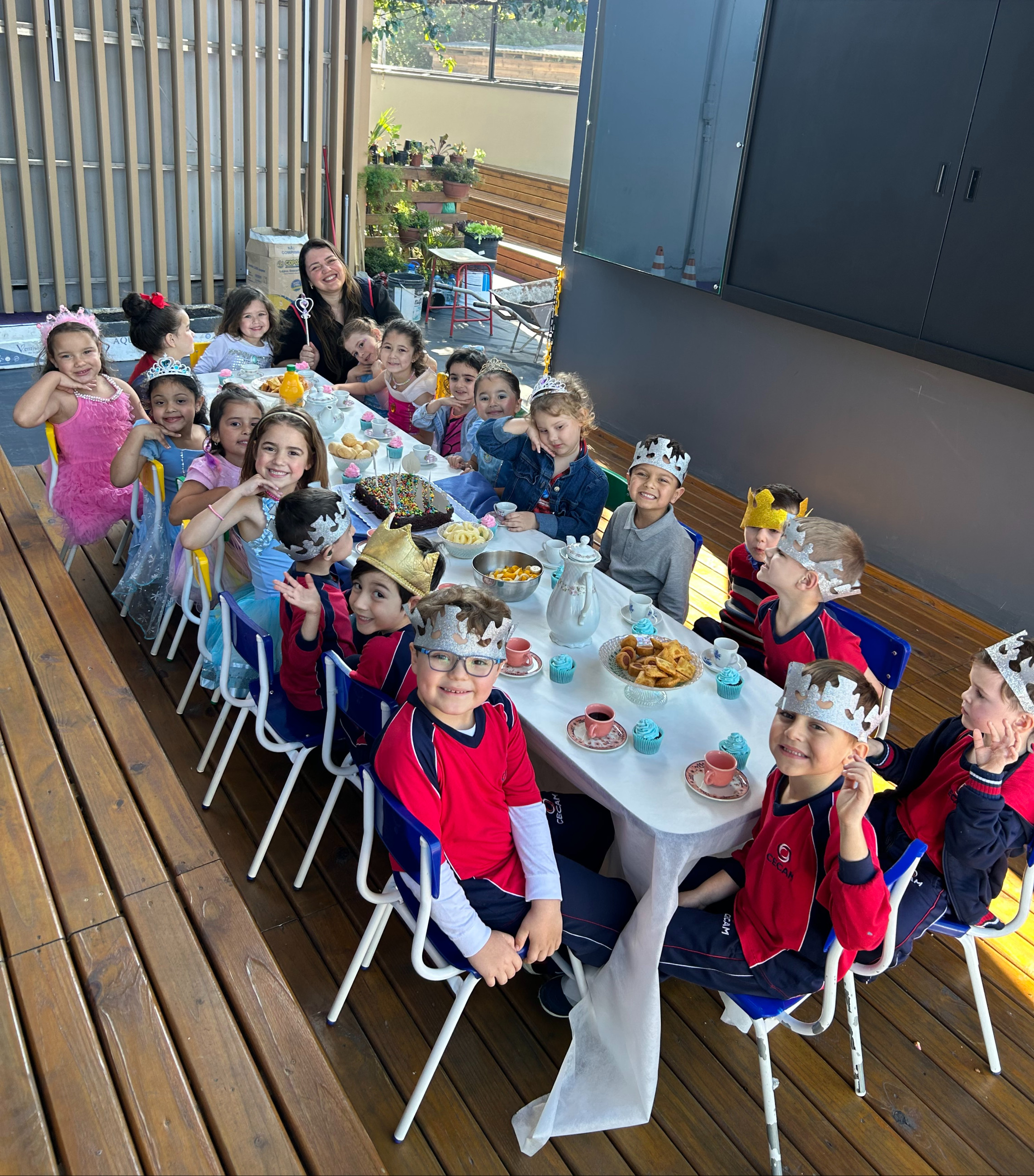 Como encerramento do projeto, nossa turma encenou um chá real, iguais aos de castelos, utilizando louças e elementos que tornassem mais parecidos com de príncipes e princesas. Cada criança veio com a roupa ou acessório semelhante aos da realeza e um trouxeram seu prato favorito, suco e até chá. Foi um momento mágico, cheio de risos, brilho nos olhos e muitas memórias afetivas.