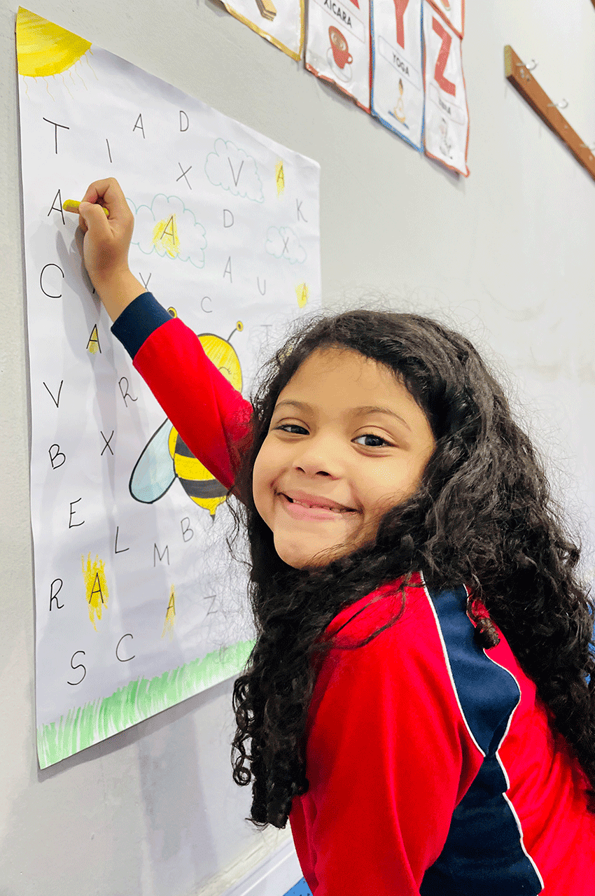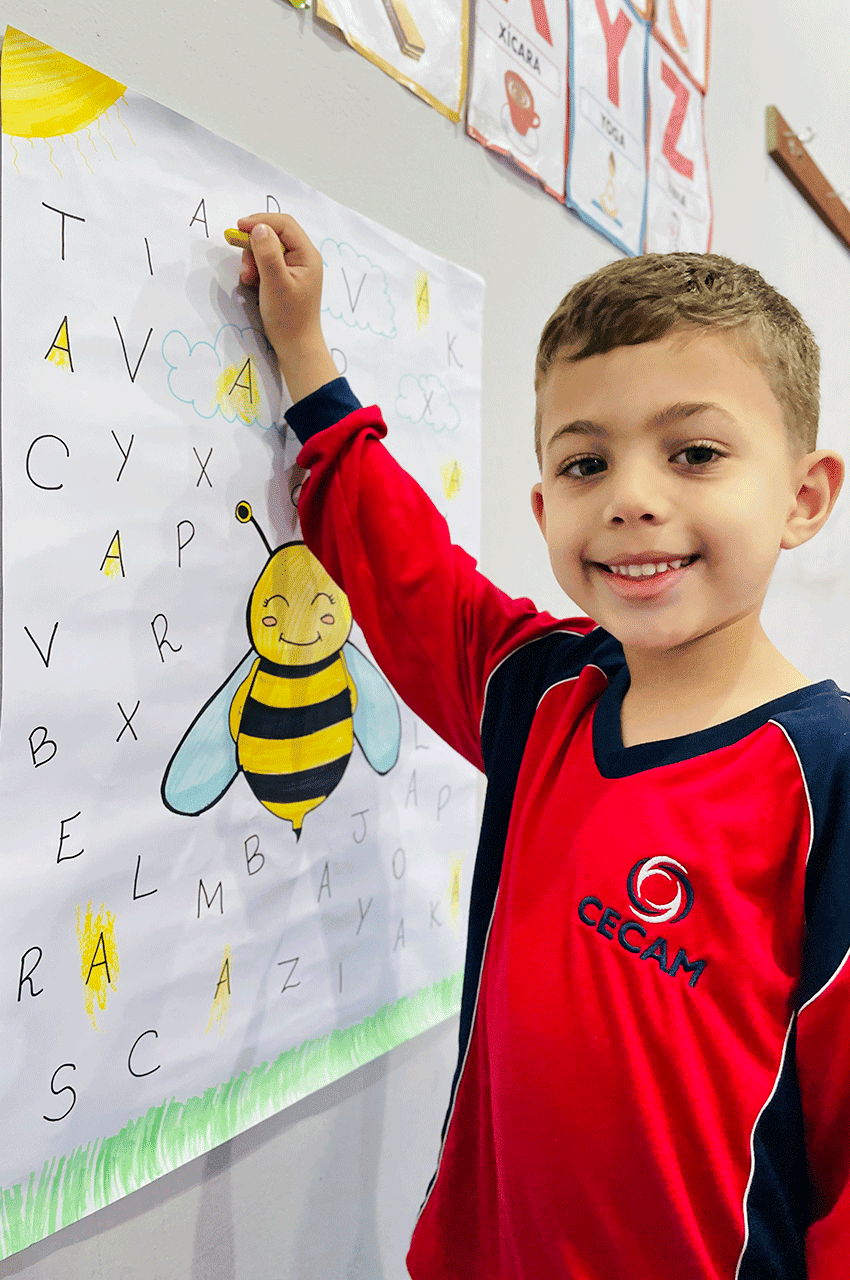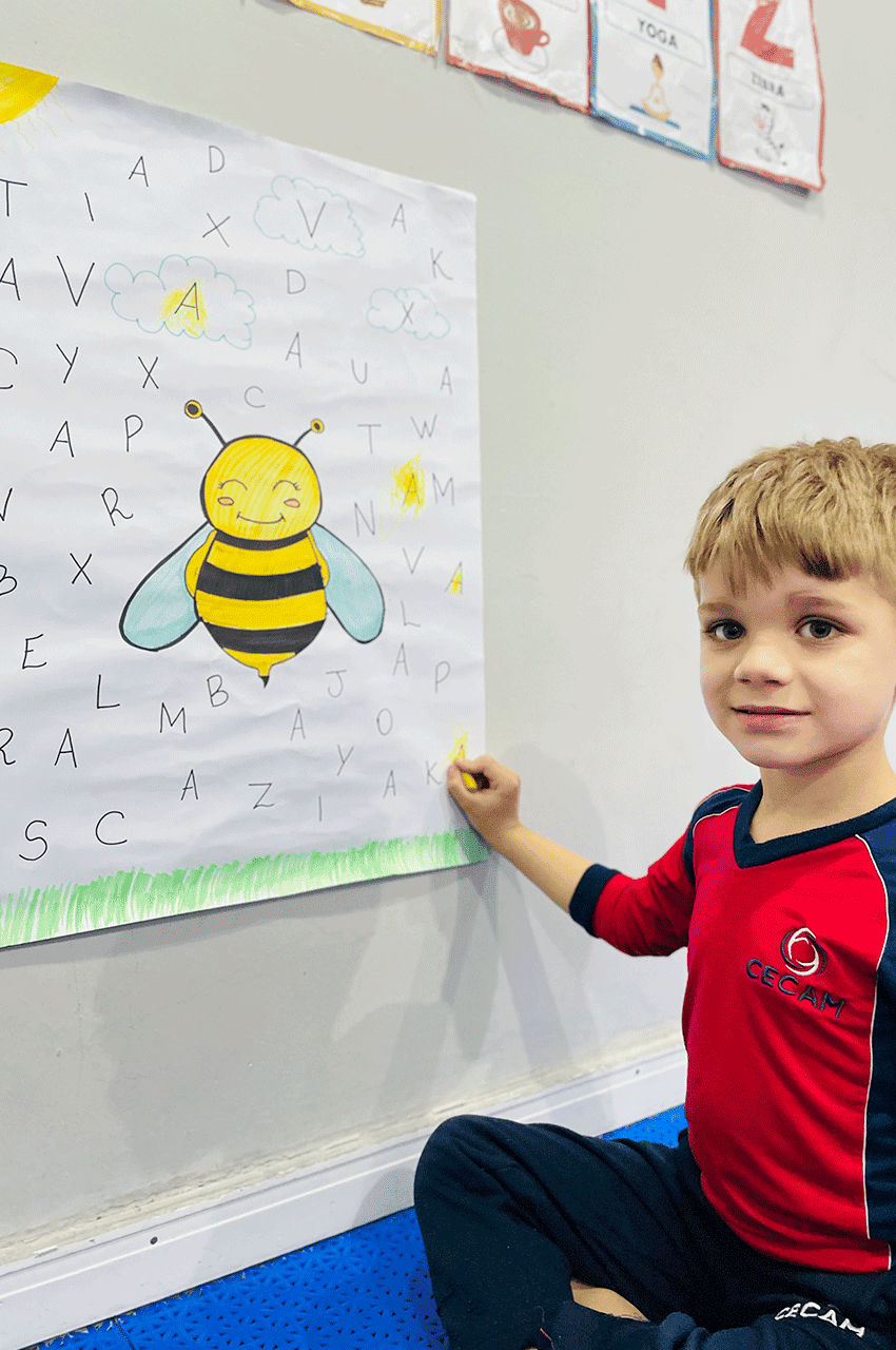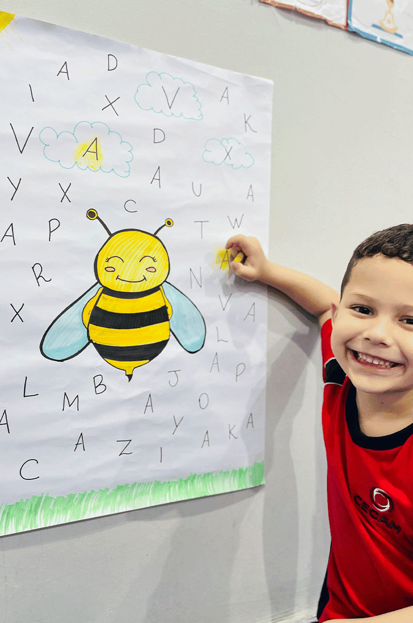Os alunos relembraram as vogais e, nesse dia, trabalhamos de forma especial a vogal A. Utilizando giz de cera, eles pintaram as letras A que estavam escondidas no meio do alfabeto. Essa dinâmica despertou a atenção, a concentração e a curiosidade dos pequenos.