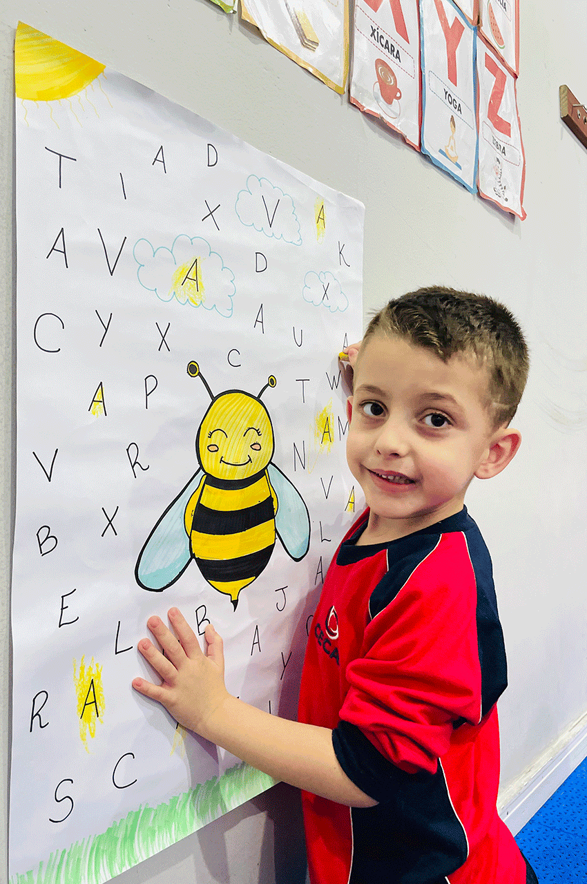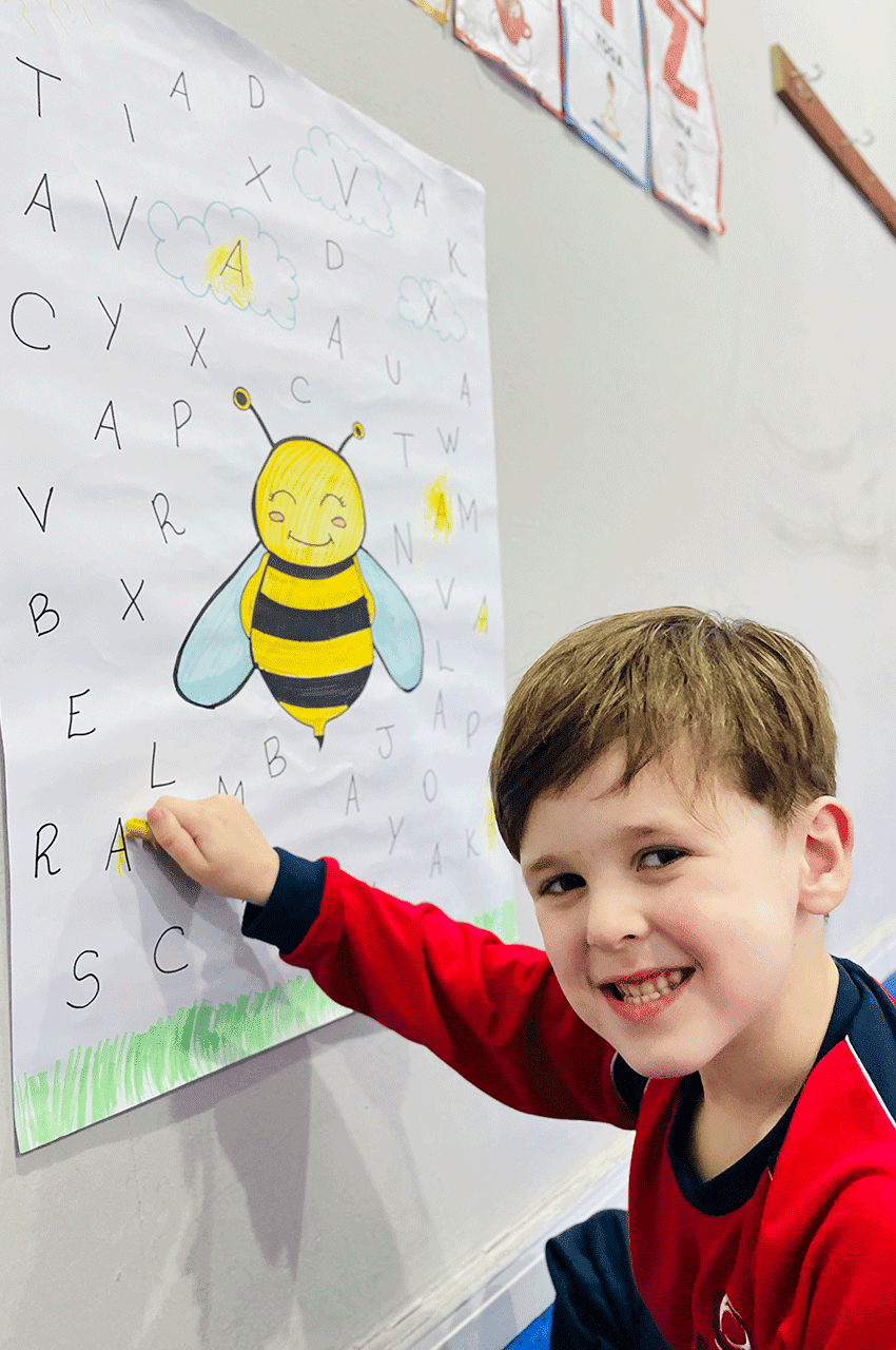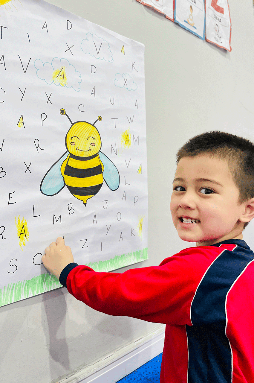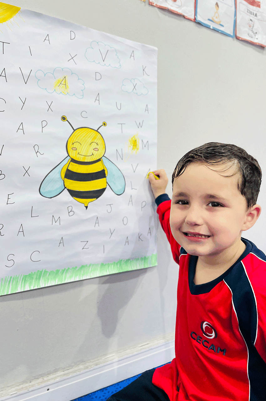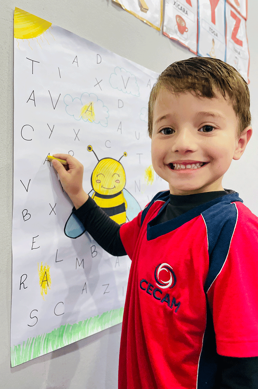 Os alunos relembraram as vogais e, nesse dia, trabalhamos de forma especial a vogal A. Utilizando giz de cera, eles pintaram as letras A que estavam escondidas no meio do alfabeto. Essa dinâmica despertou a atenção, a concentração e a curiosidade dos pequenos.
