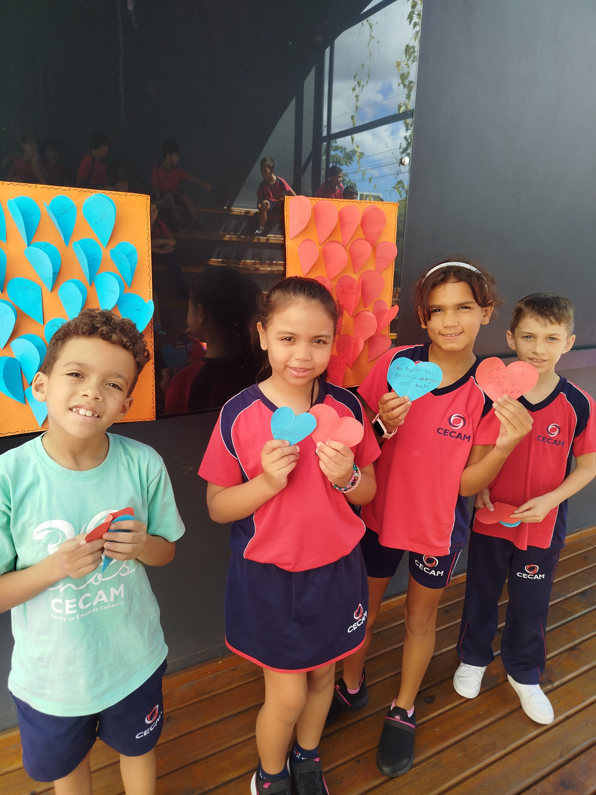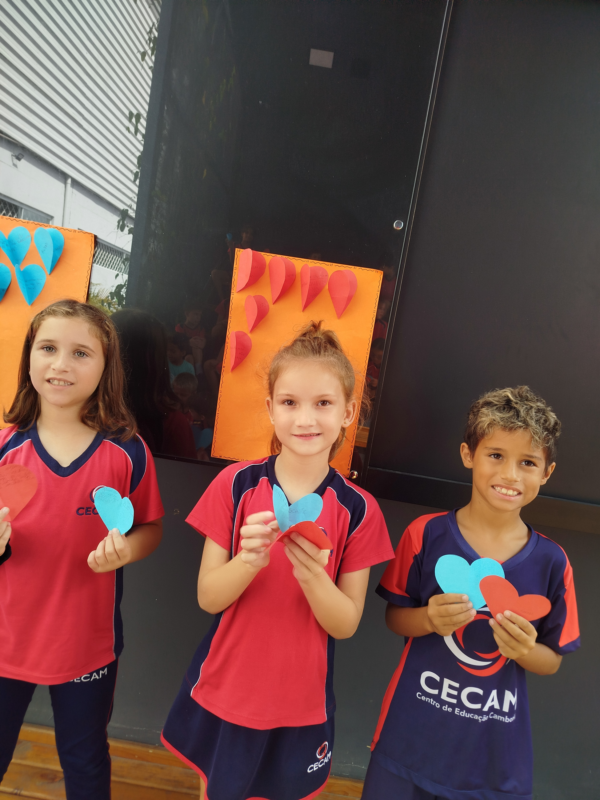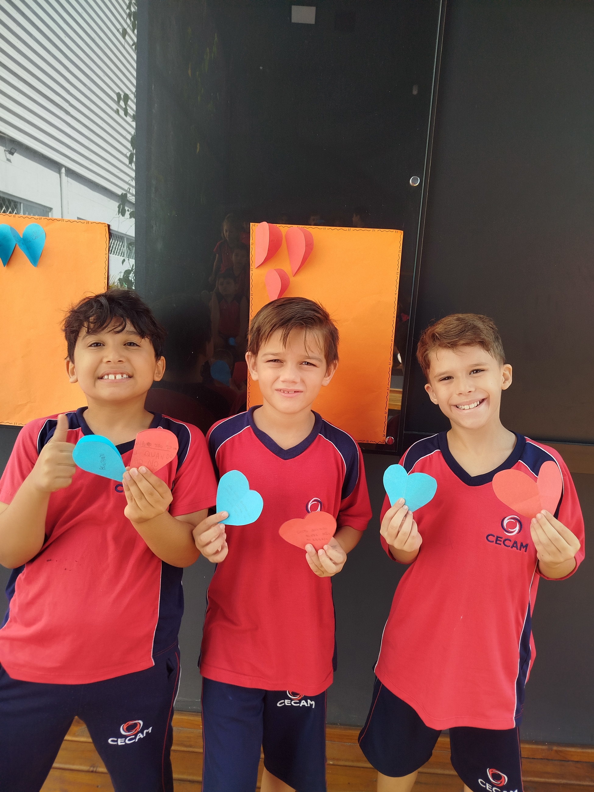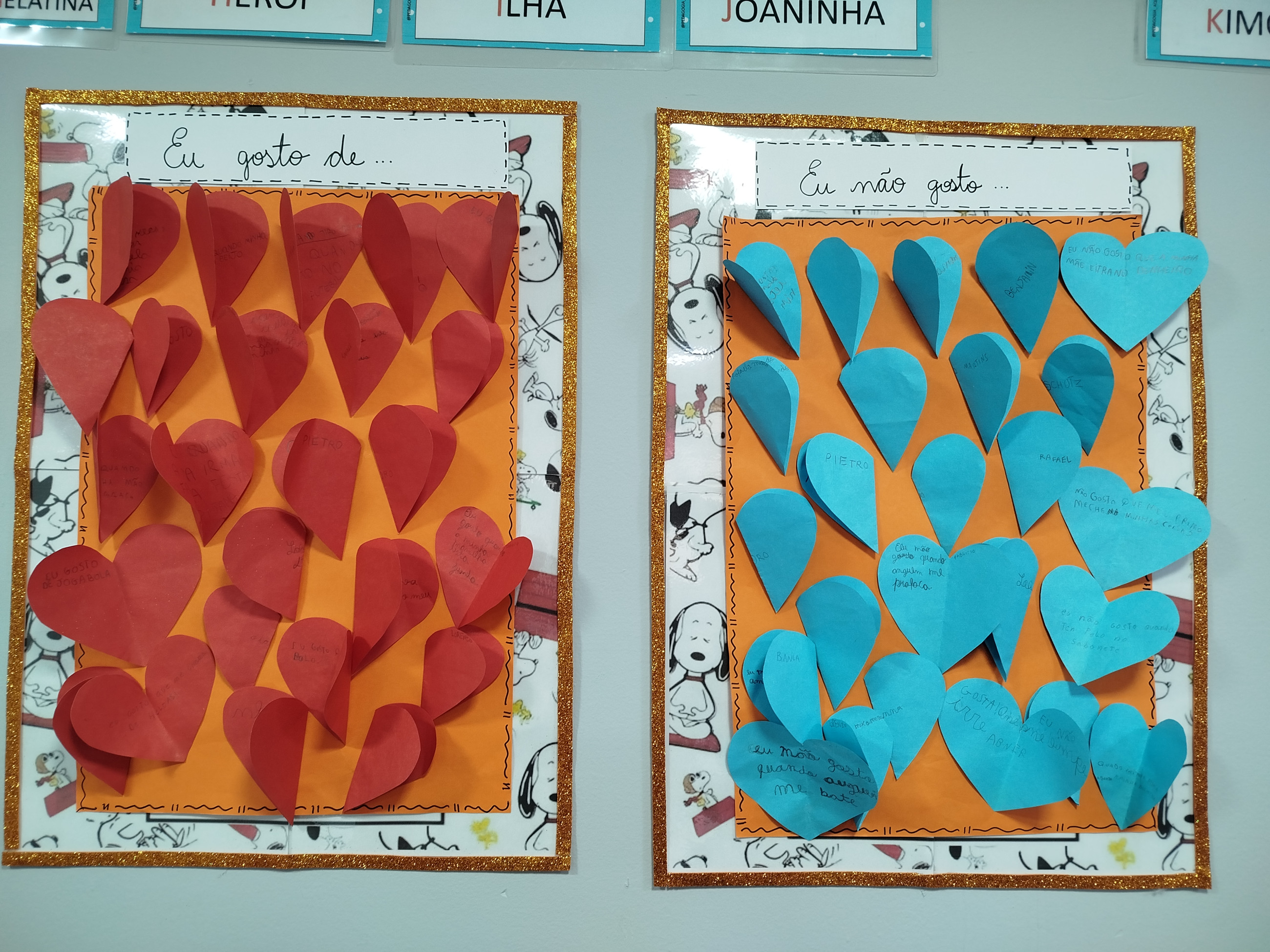 Realizamos uma atividade onde cada aluno deveria escrever em um coração de papel azul o que não gosta que façam ou digam para ele; e no coração vermelho escrever o que gostam que digam ou façam para eles. Tivemos declarações surpreendentes de carinho, afeto e boas memórias; como bolo de avô, abraço de mãe e cafuné. Assim também como alguns desabafos. Foi uma atividade muito gostosa e produtiva para a nossa turma e tornou nossa manhã ainda mais cheia de amor.