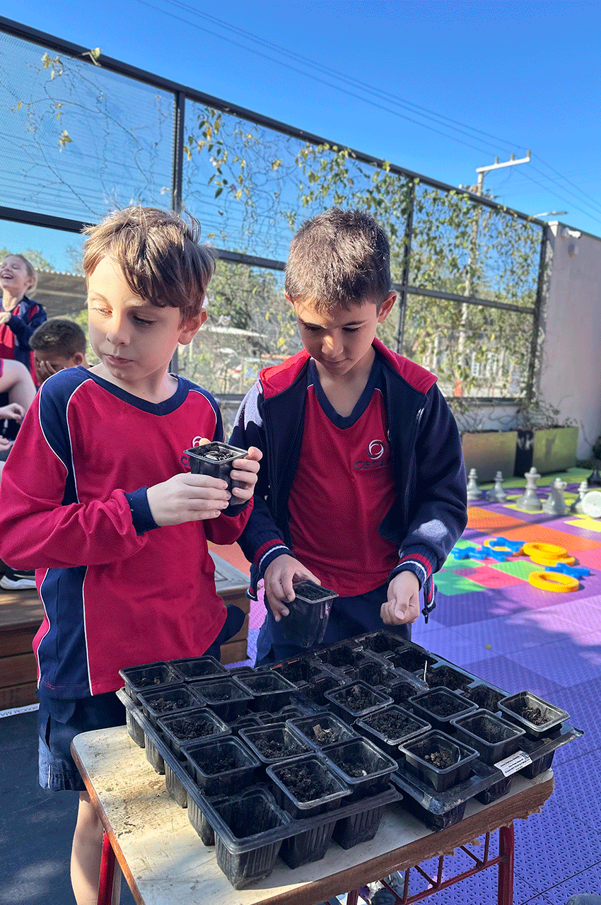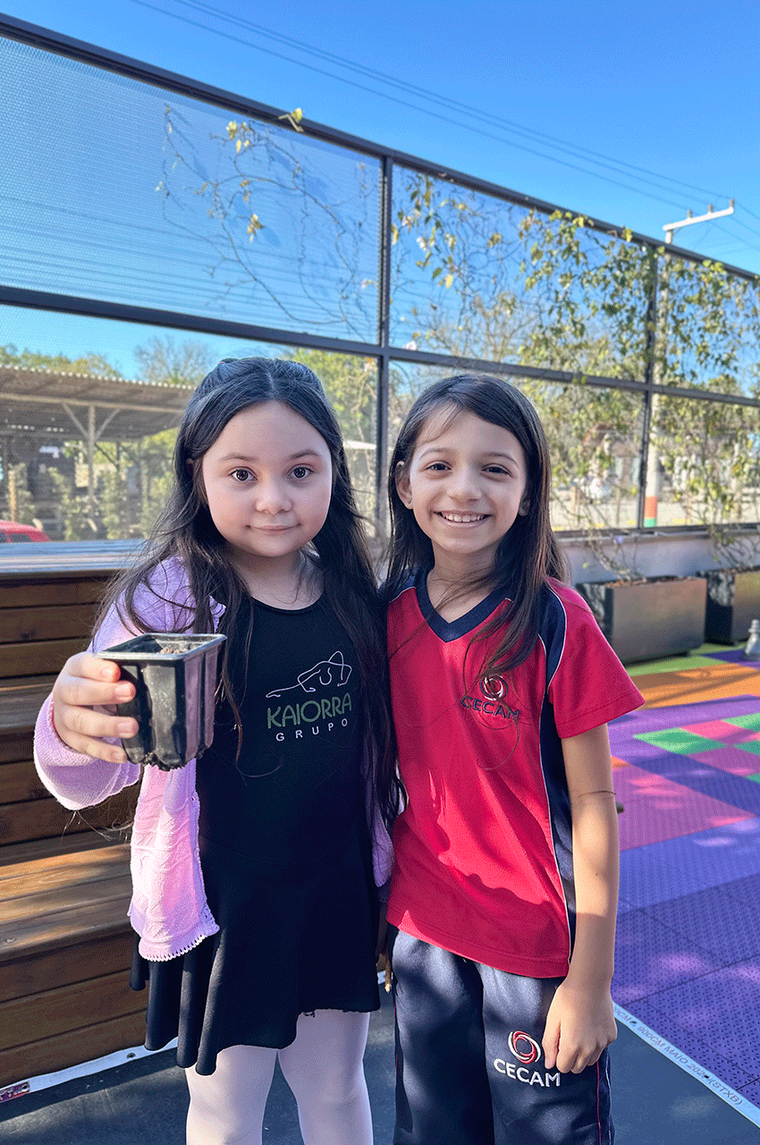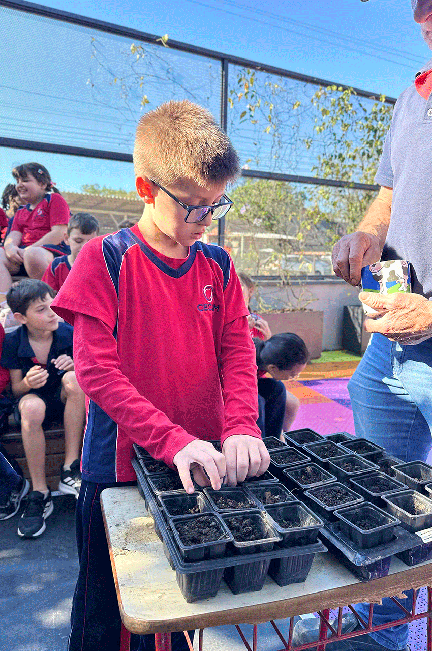 Logo ao chegar, todos estavam animados e curiosos para colocar a mão na terra. A professora explicou que a primavera é a estação do florescimento, quando a natureza se renova, os dias ficam mais ensolarados e os jardins ganham ainda mais cores. Nada melhor do que dar início a essa fase semeando uma flor tão alegre e radiante como o girassol.