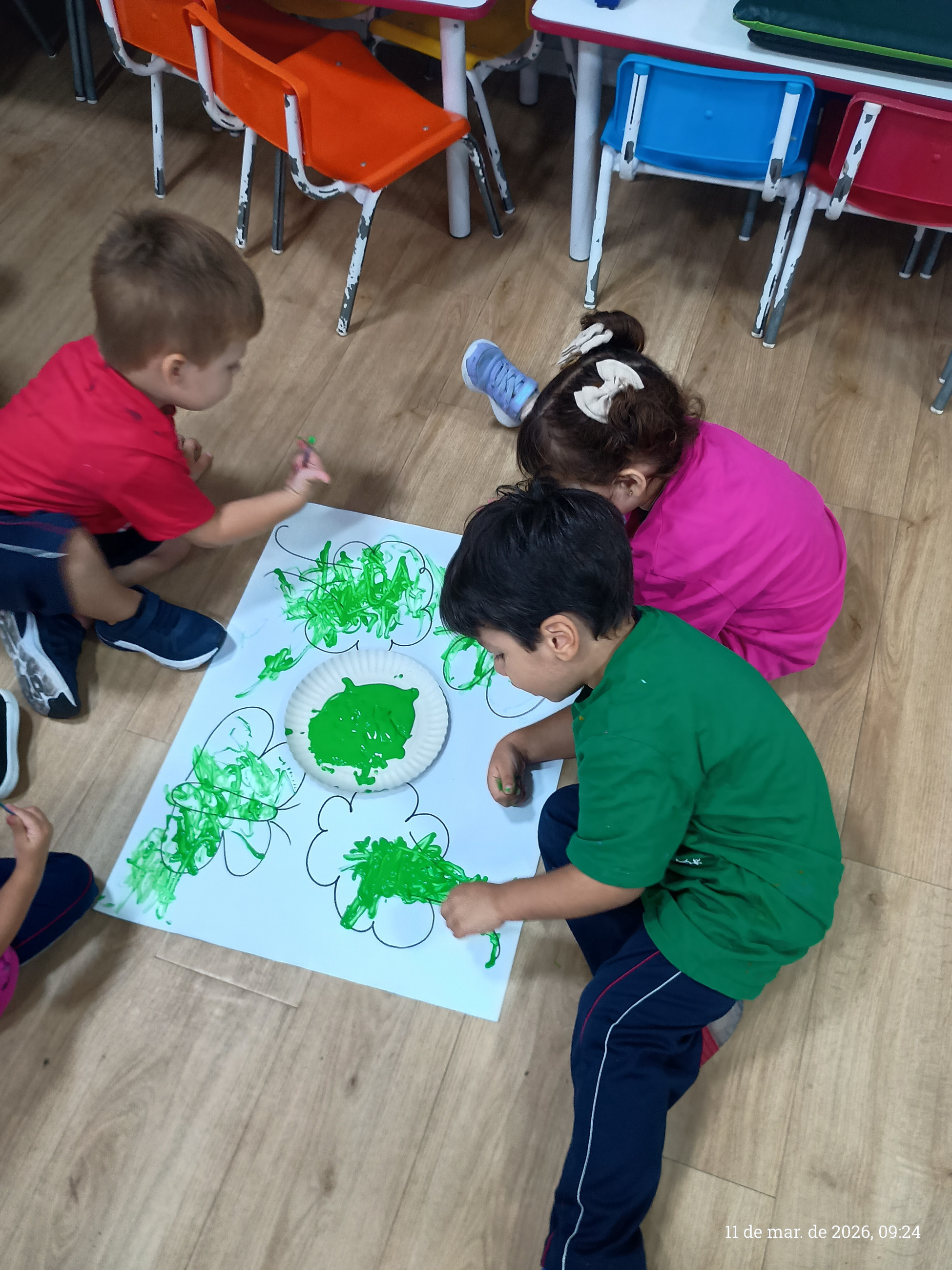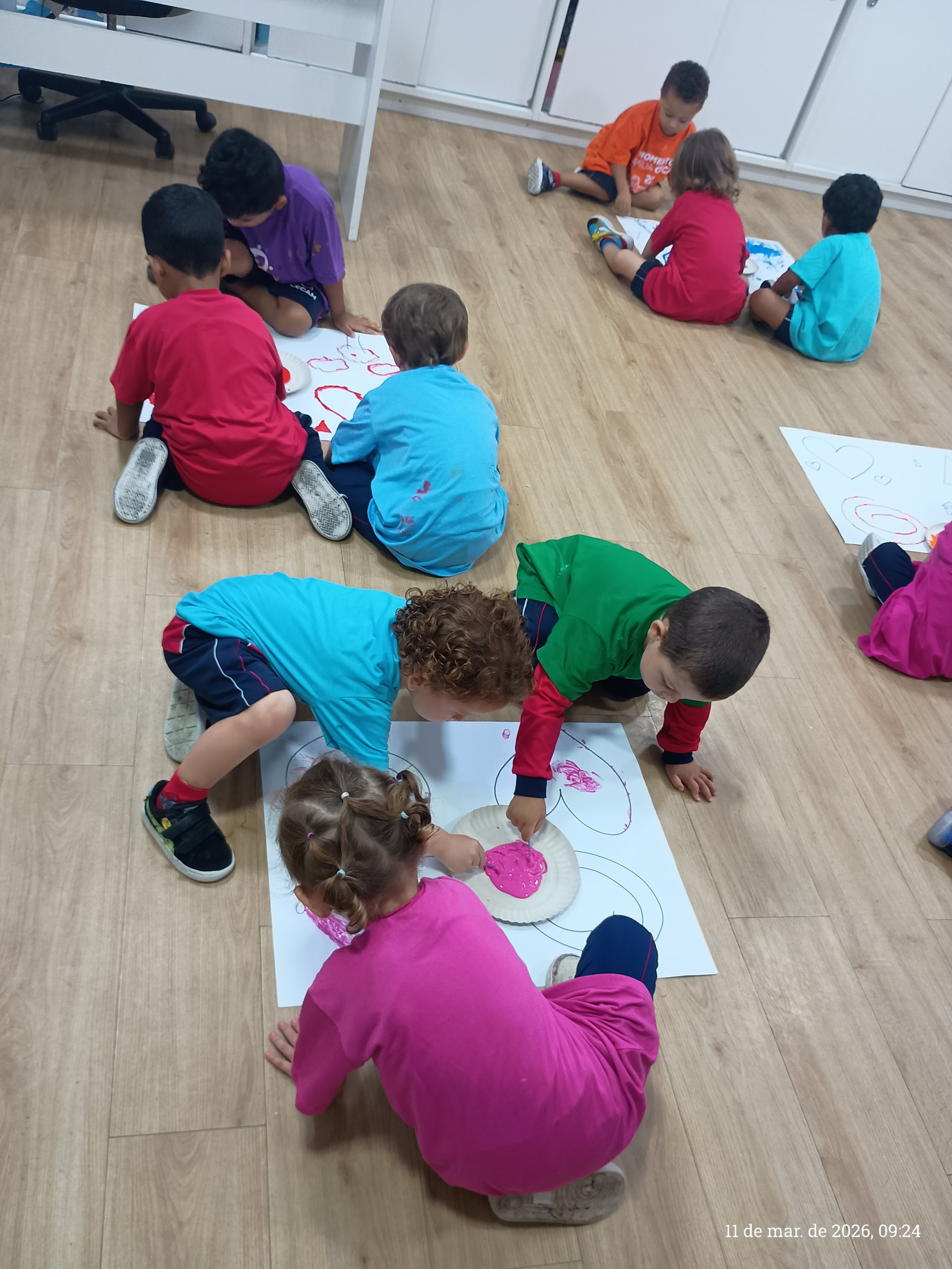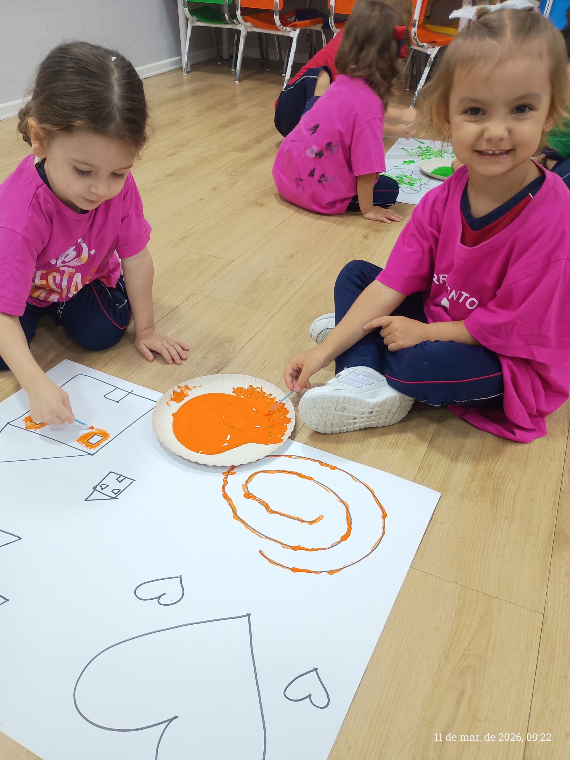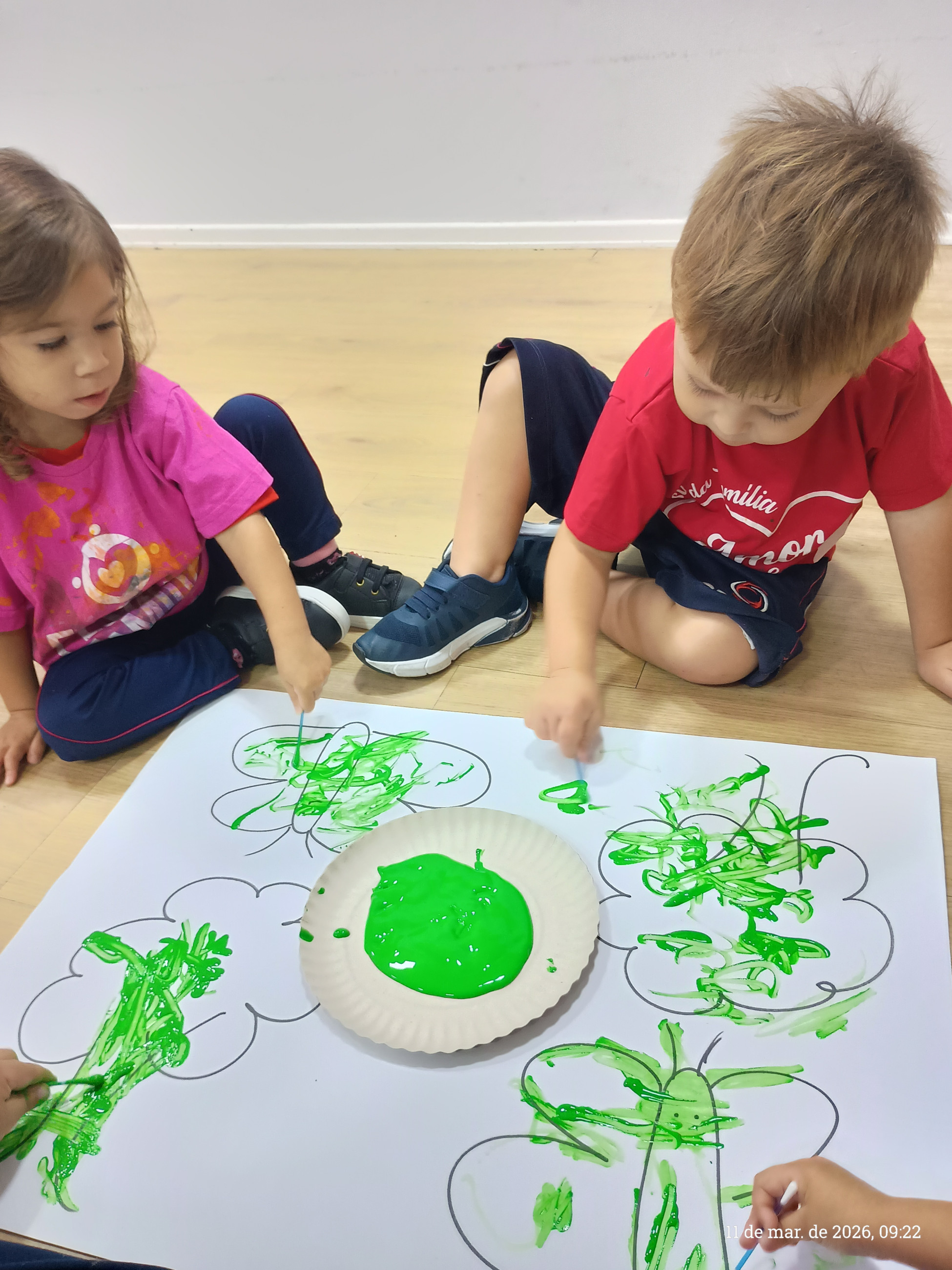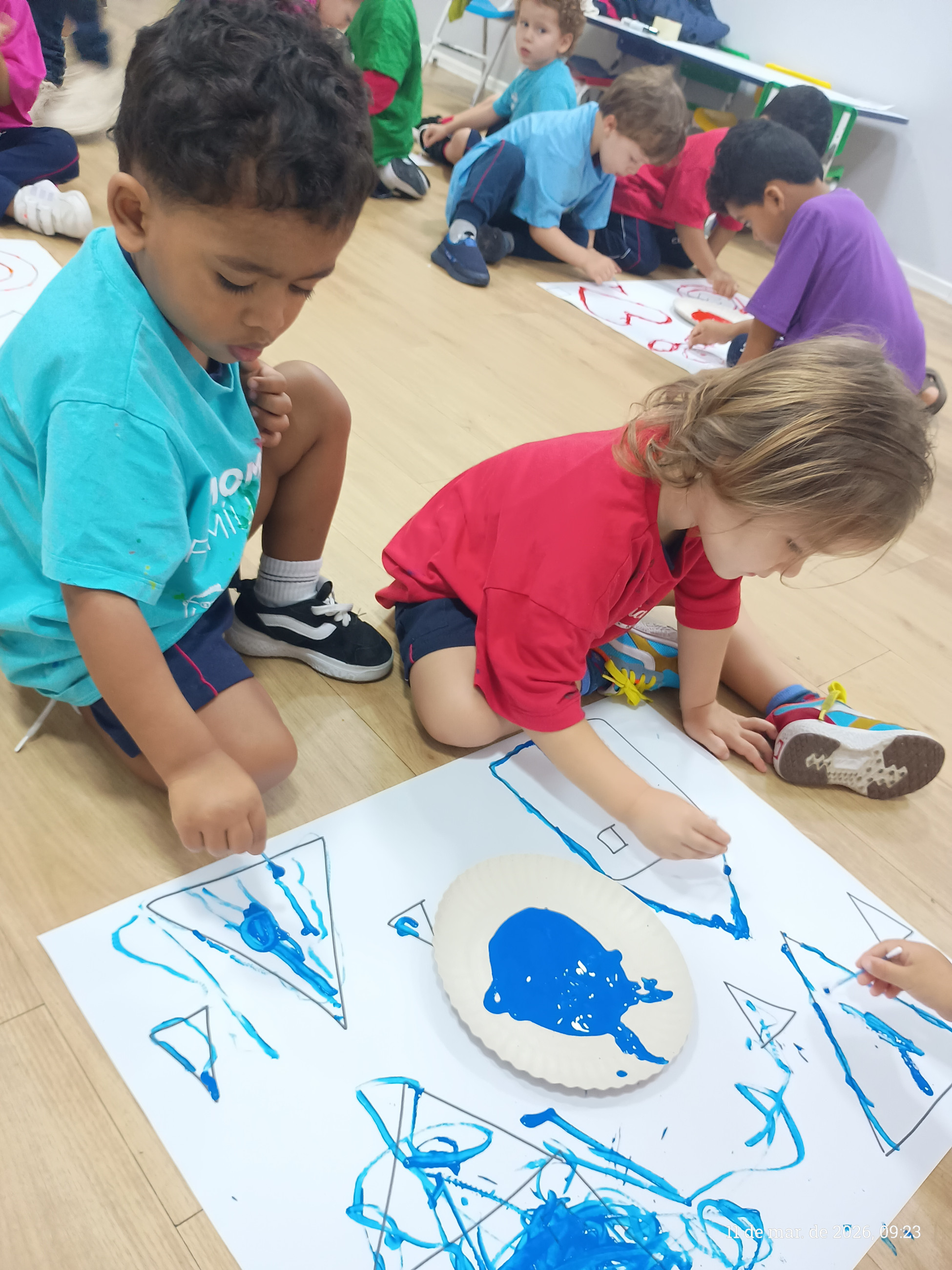 A turma do integral participou de uma atividade pedagógica especialmente pensada para estimular o desenvolvimento motor e a criatividade das crianças. A proposta consistiu em seguir os traços previamente desenhados pela professora em uma cartolina, utilizando cotonetes e tinta guache como principais ferramentas.
